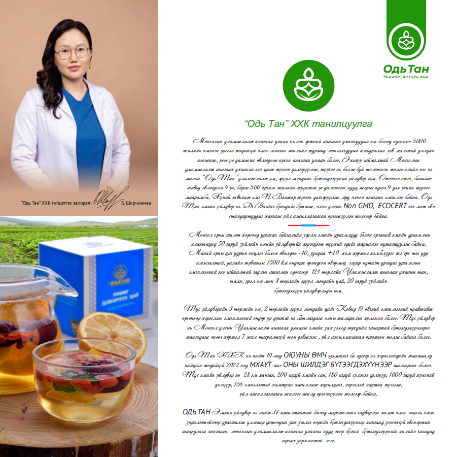 ОДЬ ТАН ЭМИЙН ҮЙЛДВЭР Монголын уламжлалт анагаах ухаан нь нэн эртний анагаах ухаануудын нэг бөгөөд одоогоос 5000 жилийн өмнөөс үүссэн төдийгүй олон мянган жилийн туршид монголчуудын амьдралын хэв маяг